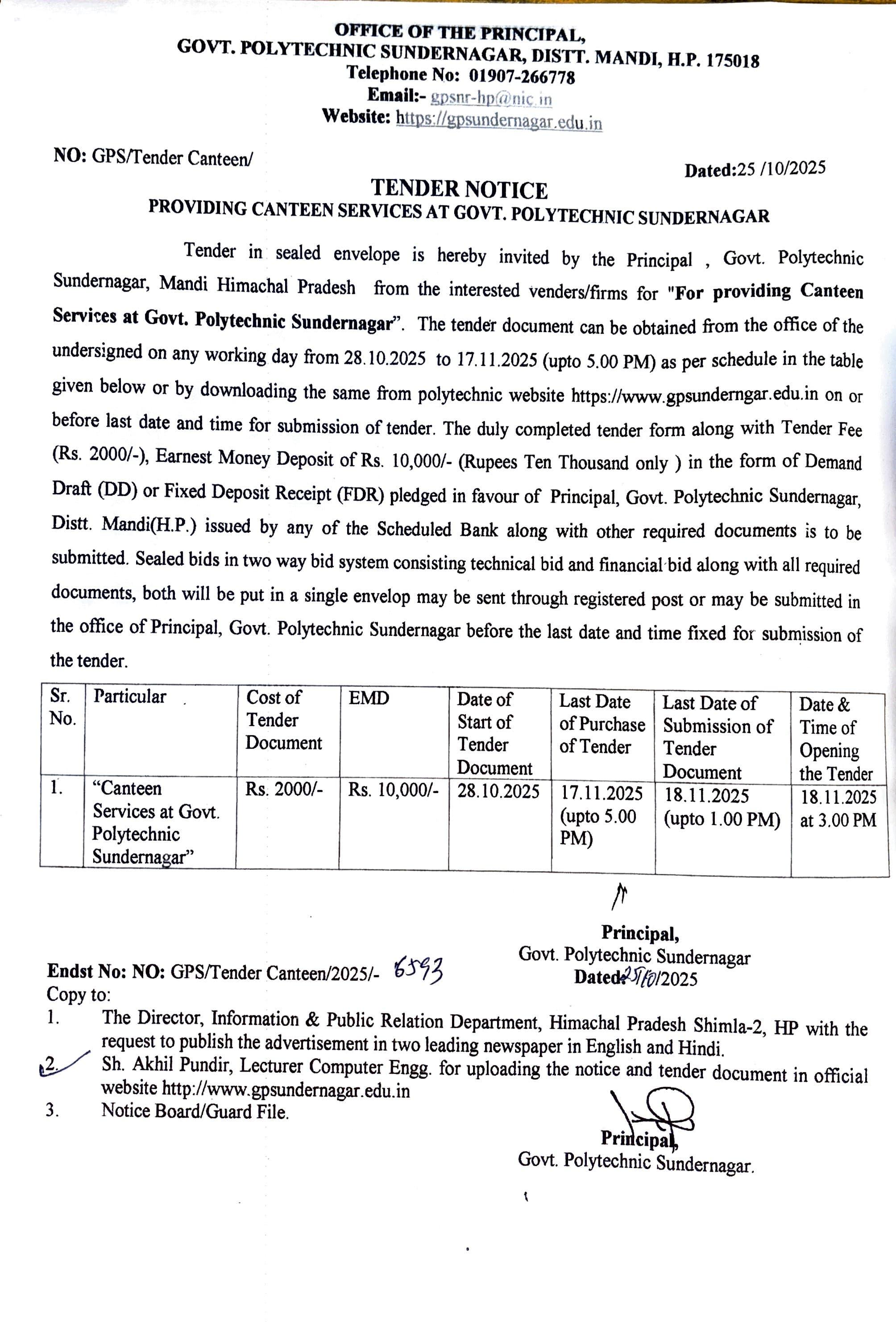 TENDER NOTICE FOR PROVIDING CANTEEN SERVICES AT GOVT. POLYTECHNIC SUNDERNAGAR, H.P.